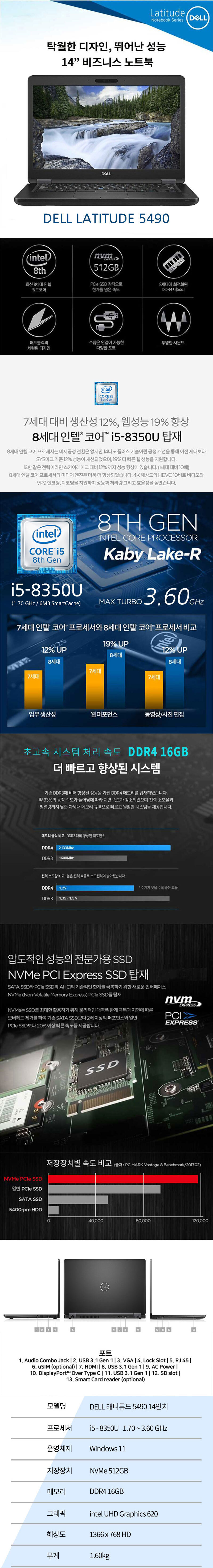 DELL 래티튜드 5490 i5-8350U/16G/NVMe SSD 512GB/UHD620/윈11 Pro 14인치 노트북