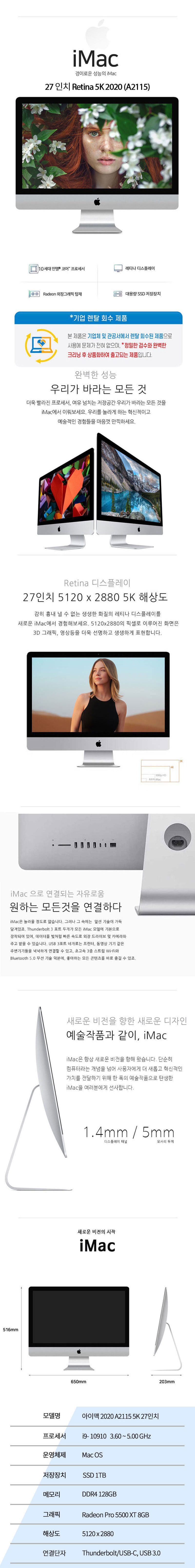 애플 아이맥 27형 2020 5K A2115 i9-10910 128G SSD 1TB Radeon Pro 5500 XT 8G